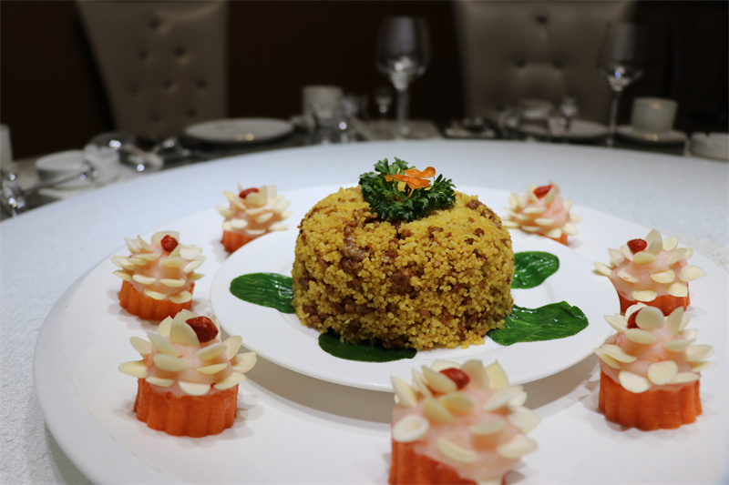 在竞争最为激烈的单品菜式评比中,中州裕丰的厨师团队同样表现不俗。他们带来的两道招牌菜——“香墨菊花盏” 与 “节虾鲜鲍炒小米” ,分别征服了专业评委和大众评审的味蕾。